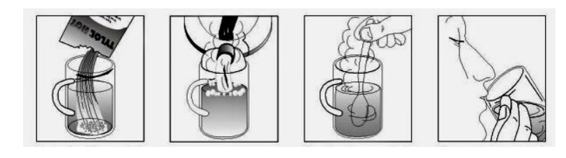 - Соджината од секоја ќесичка треба да се раствори во 80 ml (половина од стандардна големина на една шоља) топла вода и треба да се испие веднаш без претходно да се чека
