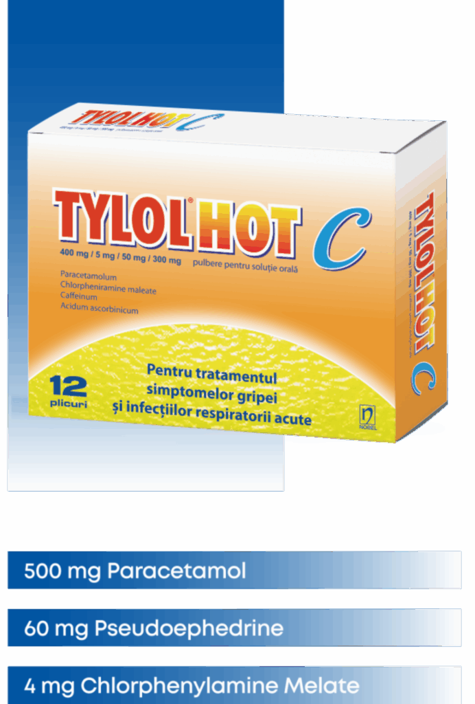 Tylol Hot C oferă o abordare îmbunătățită a ameliorării gripei, combinând beneficiile vitaminei C cu ingrediente dovedite pentru răceală și gripă. Cu 400 mg paracetamol, 5 mg maleat de clorfeniramină, 50 mg cofeină și 300 mg acid ascorbic (vitamina C), oferă o ușurare rapidă în timp ce susține sistemul imunitar.